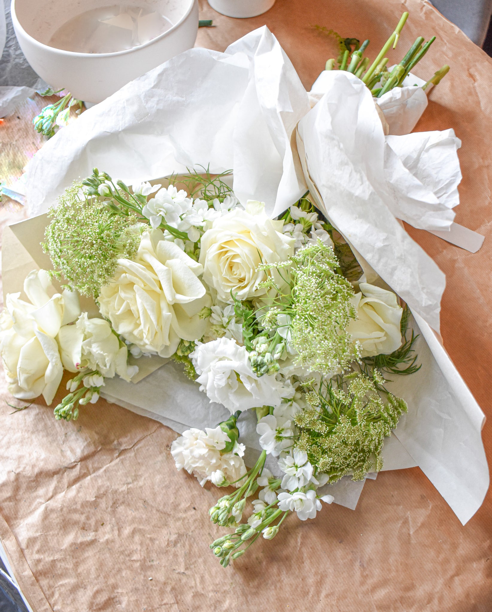 A classic flower wrapped bouquet with pretty seasonal blooms in neutral colors hand picked by the florist.